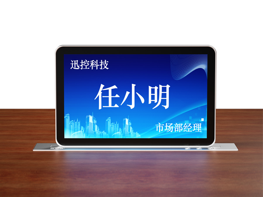 可顯示參會人員名稱、單位部門、職銜等; 10.1寸雙屏顯示,超薄一體式,無外露螺絲和連接線; 齒條導軌驅動電動升降,屏幕升降自動供電、斷電; 內部活動走線采用國際標準“坦克鏈包裹”; 控制方式:按鍵控制、無線遙控、中控控制; 航空鋁合金陽極電鍍氧化材質工藝,可選黑色/銀色。
