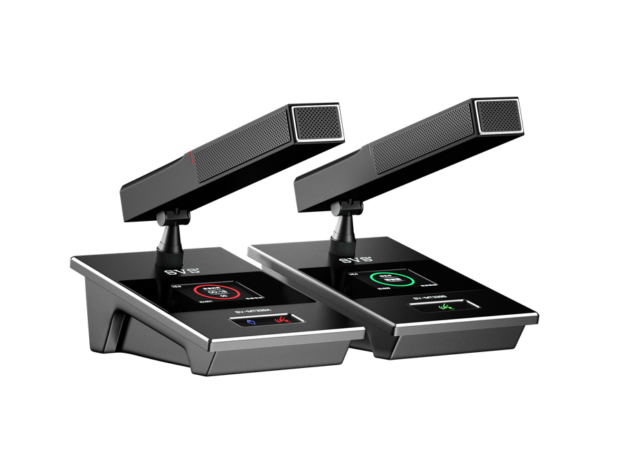 臺面可移動式會議系統發言單元采用可拔插式超短咪桿,美觀精致,單元內置大振膜拾音頭;內置彩色顯示屏,顯示當前會議模式、單元ID、發言狀態和發言正計時和倒計時等信息;單元發言采用感應式觸摸開關,內置狀態指示燈,可自由控制和提示發言狀態;具有聲控開啟單元功能,支持聲控靈敏度調節;具有發言攝像自動跟蹤功能;內置防干擾芯片,有效防止手機等外部電磁干擾。