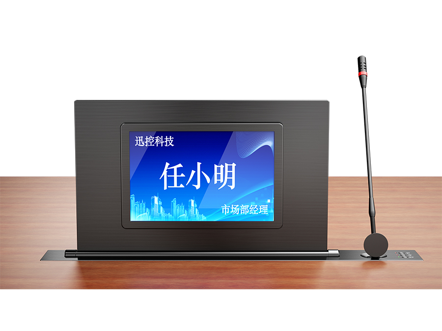 超薄液晶屏升降器,屏機聯體,主副雙面屏顯示、發言麥克風結構一體化設計;顯示屏和發言麥克風均可獨立電動升降;主面板采用鋁合金拉絲處理,帶有麥克風、升降停控制按鈕和麥克風開關按鈕;內嵌式15.6英寸高清顯示屏,IPS全視角,顯示屏支持后仰調節,支持自動復位;內嵌電容觸摸屏,支持10點觸摸;具備IPS全視角副屏。